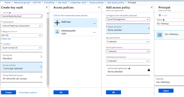 8. Once the principal is selected and clicked on ‘OK,’ the principal is shown in the list as below. Then click ‘OK’ and ‘Create’ for creating the key vault with provided details.